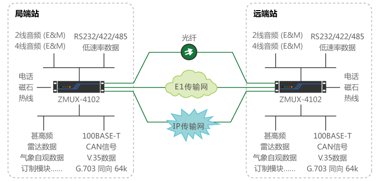 基于IP專線、光纖線路、E1 線路自動(dòng)切換:遠(yuǎn)端站到局端之間,租用運(yùn)營(yíng)商IP專線與E1線路、光纖線路,通過接入ZMUX-4102平臺(tái),完成IP專線與E1線、光纖線路自動(dòng)切換功能,保障甚高頻、雷達(dá)數(shù)據(jù)等業(yè)務(wù)的安全可靠性傳輸。