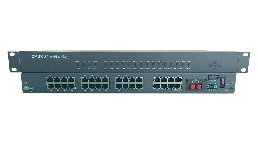 ZMUX-32-16 16路電話光端機通過光纖傳輸1~16路電話 采用模塊化設計,配備16塊業務模塊,主要完成電話、4線音頻(E&M)、RS232、網絡等多業務接入,通過復用到1路光信號傳輸,實現多業務信號點對點通信功能。